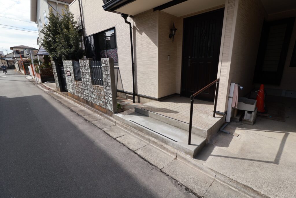 これまで段差があった箇所に、新たに適切な高さの階段を設置し、足元の安定性を高めております。特に毎日通る玄関先は、外出や帰宅の際の起点となる重要な場所です。 「転倒のリスクを最小限に抑えること」「ご自身の力でスムーズに移動できること」を最優先に考え、歩幅や足の上げやすさに配慮した設計を行いました。また、車いすを使用する際には、道路を玄関が面したことによって持ち運びのスロープを使用しやすい設計になりました!